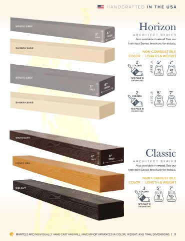 MANTELS ARE INDIVIDUALLY HAND CAST AND WILL HAVE MINOR VARIANCES IN COLOR, WEIGHT, AND FINAL DIMENSIONS | 11