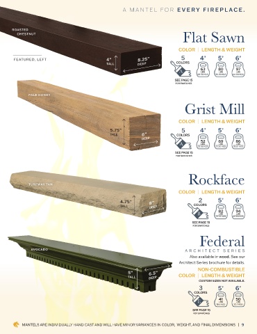 MANTELS ARE INDIVIDUALLY HAND CAST AND WILL HAVE MINOR VARIANCES IN COLOR, WEIGHT, AND FINAL DIMENSIONS | 9