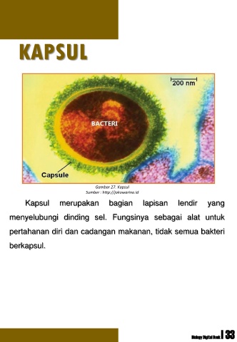 KAPSUL Gambar 27. Kapsul Sumber : http://jokowarino.id Kapsul merupakan bagian lapisan lendir yang menyelubungi dinding sel. Fungsinya sebagai alat untuk pertahanan diri dan cadangan makanan, tidak semua bakteri berkapsul. Biology Digital Book | 33