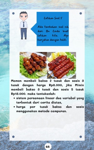 membeli bakso 3 tusuk dan sosis 5 tusuk
