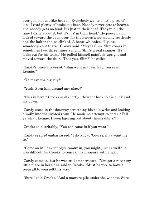 "He's in here," Crooks said shortly. He went back to his bunk and