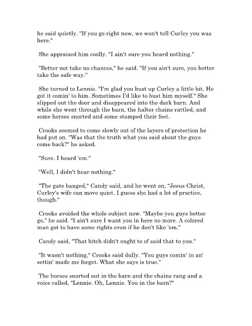She turned to Lennie. "I'm glad you bust up Curley a little bit. He