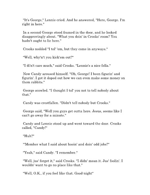 "I di'n't care much," said Crooks. "Lennie's a nice fella."