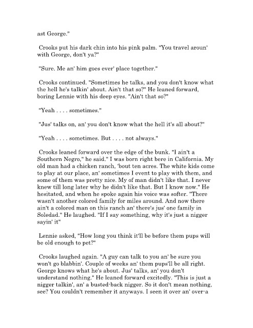 Crooks leaned forward over the edge of the bunk. "I ain't a