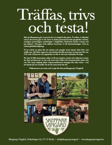 Här på Skepparp gör vi precis det en vingård ska göra. Vi odlar, vi skördar och av druvorna gör vi vin. Som vi sedan presenterar här på gården vid lan- seringar, provningar, vandringar i vingården, festivaler, fester, events och på mässor i Europa. Och såklart levererar vi till Systembolaget. Och nu också gårdsförsäljning.
