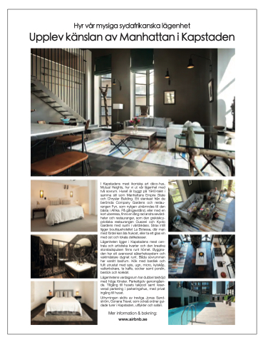 I Kapstadens mest ikoniska art déco-hus, Mutual Heights, hyr vi ut vår lägenhet med två sovrum. Huset är byggt på 1940-talet i samma stil som Manhattans Empire State och Chrysler Building. Ett stenkast från de berömda Company Gardens och restau- rangen Fyn, som nyligen utnämndes till den bästa i Afrika. På gångavstånd, eller med en kort uberresa, finns en lång rad andra sevärd- heter och restauranger, som den grekiskcy- priotiska restaurangen Ouezeri och Kyoto Gardens med sushi i världsklass. Strax intill ligger boutiquehotellet La Botessa, där man med fördel kan äta frukost, eller ta ett glas vin med ost och lokala delikatesser.
