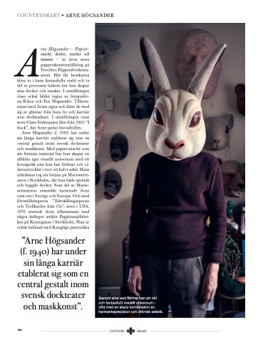 ”Arne Högsander (f. 1940) har under sin långa karriär etablerat sig som en central gestalt inom svensk dockteater och maskkonst”.