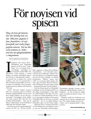 tilkammare, under ledning av Astrid Sampe, och väveriet Almedahls. Samar- betet bestod av linnebaserade textilier – ett material som var djupt rotat i svensk tradition, men som nu presenterades i helt ny skepnad: med grafiska tryck, star- ka färger och lekfullhet. Serien komplet- terades med nya produkter ända fram till 1970-talet.