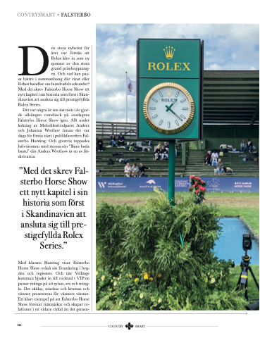 ”Med det skrev Fal- sterbo Horse Show ett nytt kapitel i sin historia som först i Skandinavien att ansluta sig till pre- stigefyllda Rolex Series.”