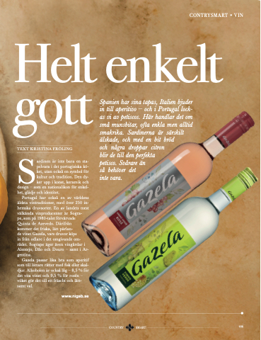 Gazela passar lika bra som aperitif som till lättare rätter med fisk eller skal- djur. Alkoholen är också låg – 8,5 % för det vita vinet och 9,5 % för rosén – vilket gör det till ett fräscht och lätt- samt val.