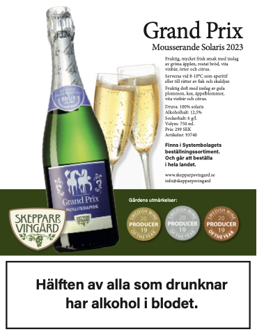 Druva: 100% solaris Alkoholhalt: 12,5% Sockerhalt: 6 g/l. Volym: 750 ml. Pris: 299 SEK Artikelnr: 93740