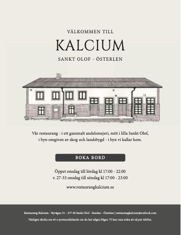 Restaurang Kalcium - Byvägen 31 - 277 40 Sankt Olof - Sweden - Österlen | restaurangkalcium@outlook.com Vänligen skicka oss ett e-postmeddelande om du har några frågor. Vi kan vara svåra att nå per telefon.