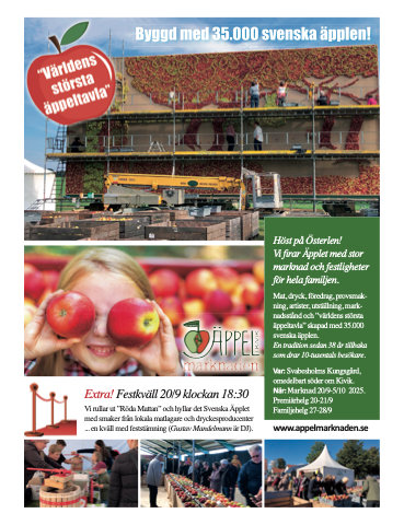 Mat, dryck, föredrag, provsmak- ning, artister, utställning, mark- nadsstånd och ”världens största äppeltavla” skapad med 35.000 svenska äpplen.
