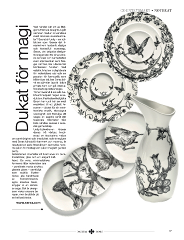 Vad händer när ett av Bel‐ giens främsta designhus går samman med en av världens mest ikoniska musikfestiva‐ ler? Svaret är Unity – en kol‐ lektion som förenar det fi‐ naste inom hantverk, design och fantasifull scenmagi. Serax, det belgiska design‐ företaget känt för sina stilre‐ na serviser och samarbeten med stjärnkockar som Ser‐ gio Herman, har i decennier kombinerat funktion med estetik. Med en tydlig känsla för materialens själ och en passion för formspråk som håller över tid, har Serax bli‐ vit en självklar favorit i både privata hem och på interna‐ tionella topprestauranger. Tomorrowland å sin sida be‐ höver knappast någon intro‐ duktion. Festivalen i belgiska Boom har vuxit från en lokal musikfest till ett globalt fe‐ nomen – älskat för sin elek‐ troniska musik, storslagna scenografi och förmåga att skapa en sagolik värld där tusentals människor från hela världen samlas i eufo‐ risk gemenskap. Unity‐kollektionen förenar dessa två världar. Inspi‐ rerad av festivalens vision