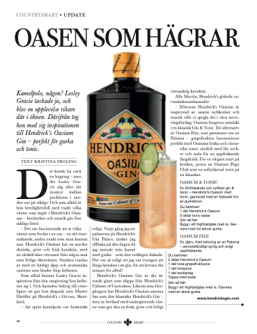 Hendrick’s Oasium Gin är det åt- tonde ginet som släpps från Hendrick’s Cabinet of Curiosities. Liksom sina före- gångare har Hendrick’s Oasium samma bas som den klassiska Hendrick’s Gin – men är berikad med oasinspirerade väx- ter som ger den en frisk, grön och livligt