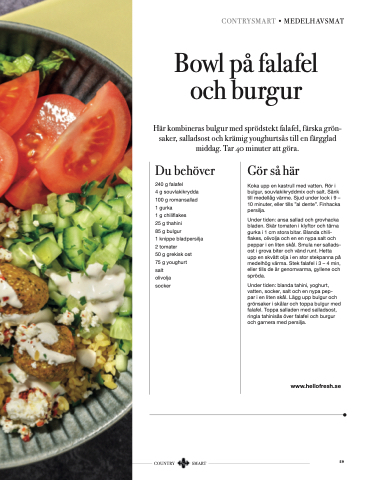 Här kombineras bulgur med sprödstekt falafel, färska grön- saker, salladsost och krämig youghurtsås till en färgglad middag. Tar 40 minuter att göra.