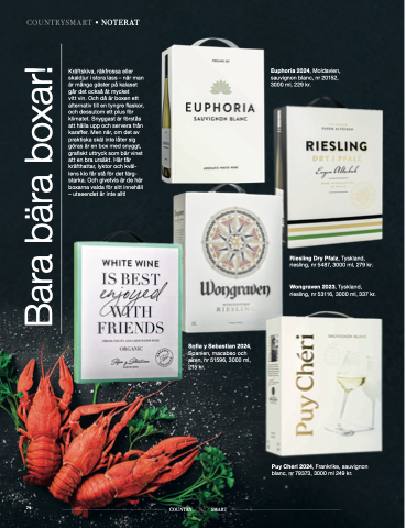 vitt vin. Och då är boxen ett alternativ till en tyngre flaskor, och dessutom ett plus för klimatet. Snyggast är förstås att hälla upp och servera från karaffer. Men när, om det av praktiska skäl inte låter sig göras är en box med snyggt, grafiskt uttryck som bär vinet att en bra ursäkt. Här får kräfthattar, lyktor och kväl‐ lens klo får stå för det färg‐ starka. Och givetvis är de här boxarna valda för sitt innehåll – utseendet är inte allt!