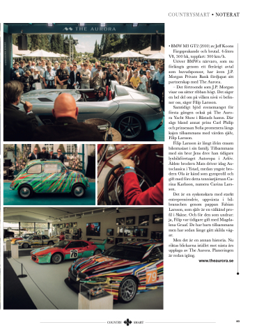 Filip Larsson är långt ifrån ensam bilentusiast i sin familj. Tillsammans med sin bror Jens drev han tidigare lyxbilsföretaget Autoropa i Arlöv. Äldste brodern Mats driver idag Au- toclassica i Ystad, medan yngste bro- dern Ola är känd som gymprofil och gift med före detta tennisstjärnan Ca- rina Karlsson, numera Carina Lars- son.