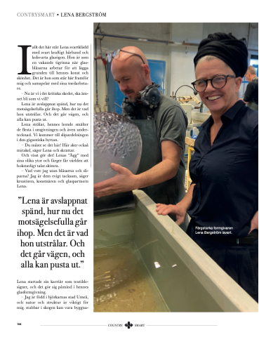 Iallt det här står Lena svartklädd med svart kraftigt hårband och kolsvarta glasögon. Hon är som en vakande tigrinna när glas- blåsarna arbetar för att lägga grunden till hennes konst och skönhet. Det är hon som står här framför mig och samspelar med sina medarbeta- re.