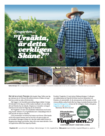 Brf Vingården 2:9 med 16 bostadsrätter tillsammans med restau- rang, hotell, vinbaren 2:9 och gårdsbutik mitt i vinlandskapet blir ett helt nytt sätt att njuta av Österlen.