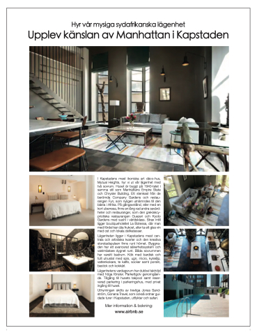 Lägenheten ligger i Kapstadens mest cen- trala och artistiska kvarter och den kreativa storstadspulsen finns runt hörnet. Byggna- den har ett avancerat säkerhetssystem och vaktmästare dygnet runt. Båda sovrummen har varsitt badrum. Kök med bardisk och fullt utrustat med spis, ugn, micro, kylskåp, vattenkokare, te kaffe, socker samt porslin, bestick och kokkärl.