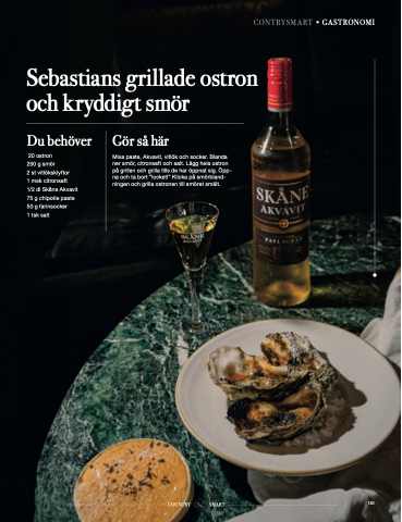 Mixa paste, Akvavit, vitlök och socker. Blanda ner smör, citronsaft och salt. Lägg hela ostron på grillen och grilla tills de har öppnat sig. Öpp- na och ta bort ”locket!” Klicka på smörbland- ningen och grilla ostronen till smöret smält.