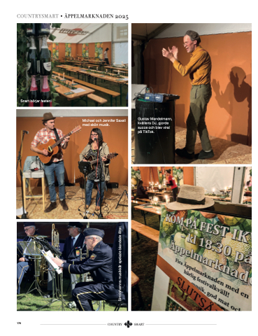 COUNTRYSMART • ÄPPELMARKNADEN 2025 Snart börjar festen! Michael och Jennifer Saxell med skön musik. Gustav Mandelmann, kvällens DJ, gjorde succé och blev viral på TikTok. Simrishamns musikkår spelade blandade låtar. 170 COUNTRY SMART