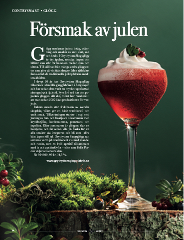 Glögg markerar julens intåg, stäm- ning och smaker av sött, surt, salt och beskt. I Grythyttan Skogsglögg är det äpplen, svenska lingon och blåbär som står för balansen mellan syra och sötma. Till skillnad från många andra glöggsor- ter som görs på vin från druvor. Men självklart finns också de traditionella julkryddorna med i smakbilden.
