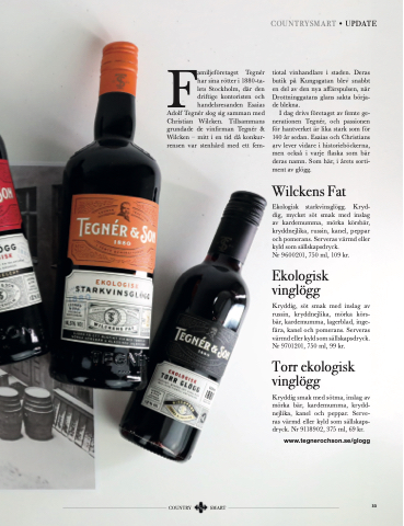 I dag drivs företaget av femte ge- nerationen Tegnér, och passionen för hantverket är lika stark som för 140 år sedan. Esaias och Christians arv lever vidare i historieböckerna, men också i varje flaska som bär deras namn. Som här, i årets sorti- ment av glögg.