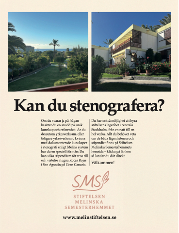 Om du svarar ja på frågan besitter du en snudd på unik kunskap och erfarenhet. Är du dessutom yrkesverksam, eller tidigare yrkesverksam, kvinna med dokumenterade kunskaper i stenografi enligt Melins system har du en speciell förmån: Du kan söka stipendium för resa till och vistelse i lugna Rocas Rojas i San Agustín på Gran Canaria.