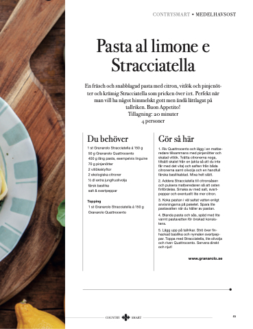 En fräsch och snabblagad pasta med citron, vitlök och pinjenöt- ter och krämig Stracciatella som pricken över i:et. Perfekt när man vill ha något himmelskt gott men ändå lättlagat på tallriken. Buon Appetito!