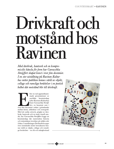 över fem decennier verkat i gränslandet mellan konst, arkitektur och scenografi. Med sitt unika uttryck, präglat av åter- bruk, hantverk och en stark visuell este- tik, har Carouschka Streijffert byggt ett konstnärskap där materialens historia och människans inverkan på miljön står i fokus. I utställningen Drivkraftens seger över motståndet möter betraktaren hen- nes värld av objekt, collage och rumsli- ga berättelser – en rik och mångbottnad
