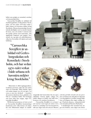 – Materialet är alltid utgångspunkten. Lockelsen att forma, tukta det som andra ratat och förbrukat. Mina händer, ögon och tankar skapar om och om igen, i en rytm av min inre drivkraft – i motstån- det smärtar skönheten fram, påkallar och föds in i estetikens helhet. Ett kretslopp som bara tiden kan stoppa, säger Ca- rouschka Streijffert.