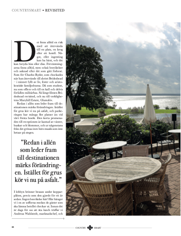 ”Redan i allén som leder fram till destinationen märks förändring- en. Istället för grus kör vi nu på asfalt.”