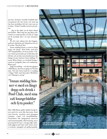 Här i Hill House gäller istället fransk bi- stro med à la carte eller fast meny. Start med brioche, tartelette med säsongens svampar, comté och krondillsättika. Varmrätten blir hängmörad entrecote med sensommarkål, rökt benmärg, sauce provençale för Lars, och jag väljer smör- stekt piggvar på benet med citron, beur- re noisette, mangold och grillad grädde.