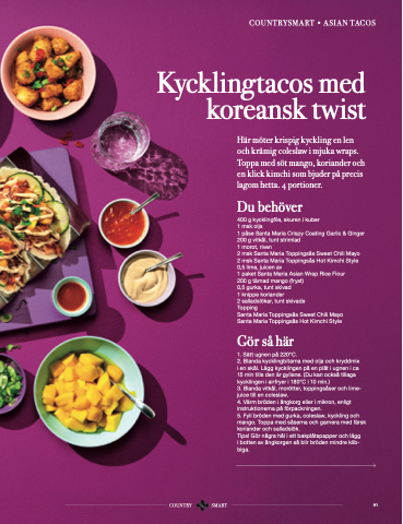 Här möter krispig kyckling en len och krämig coleslaw i mjuka wraps. Toppa med söt mango, koriander och en klick kimchi som bjuder på precis lagom hetta. 4 portioner.