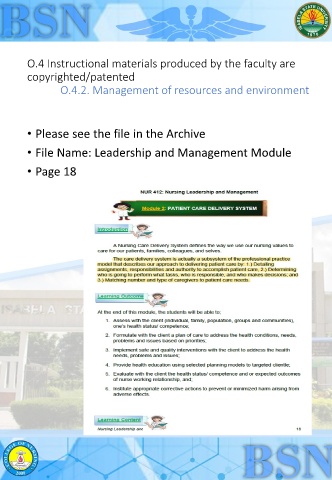O.4 Instructional materials produced by the faculty are copyrighted/patented O.4.2. Management of resources and environment • Please see the file in the Archive • File Name: Leadership and Management Module • Page 18