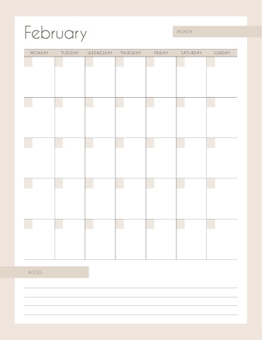 February MONTH: MONDAY TUESDAY WEDNESDAY THURSDAY FRIDAY SATURDAY SUNDAY NOTES: