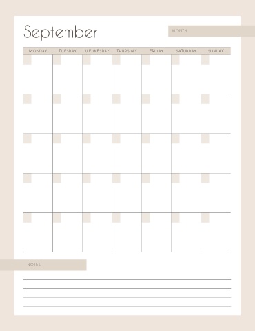 September MONTH: MONDAY TUESDAY WEDNESDAY THURSDAY FRIDAY SATURDAY SUNDAY NOTES: