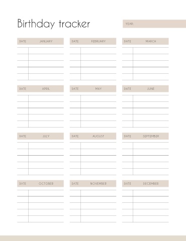 Birthday tracker YEAR: DATE JANUARY DATE FEBRUARY DATE MARCH DATE APRIL DATE MAY DATE JUNE DATE JULY DATE AUGUST DATE SEPTEMBER DATE OCTOBER DATE NOVEMBER DATE DECEMBER