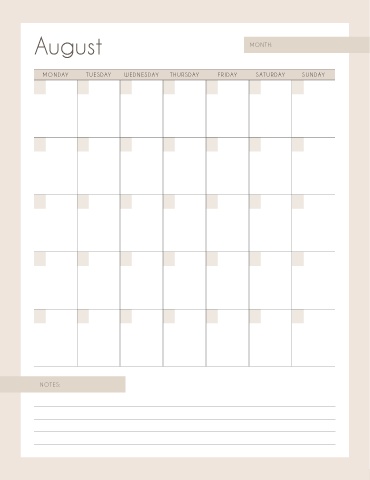 August MONTH: MONDAY TUESDAY WEDNESDAY THURSDAY FRIDAY SATURDAY SUNDAY NOTES: