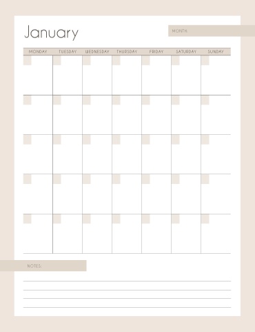 January MONTH: MONDAY TUESDAY WEDNESDAY THURSDAY FRIDAY SATURDAY SUNDAY NOTES: