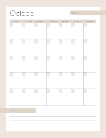 October MONTH: MONDAY TUESDAY WEDNESDAY THURSDAY FRIDAY SATURDAY SUNDAY NOTES: