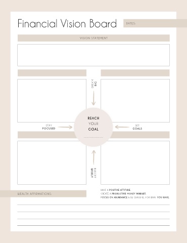 Financial Vision Board DATES: VISION STATEMENT DREAM BIG REACH YOUR STAY SET FOCUSED GOAL GOALS WISELY BUDGET HAVE A POSITIVE ATTITUDE. WEALTH AFFIRMATIONS: CREATE A PRODUCTIVE MONEY MINDSET. FOCUS ON ABUNDANCE & BE GRATEFUL FOR WHAT YOU HAVE.