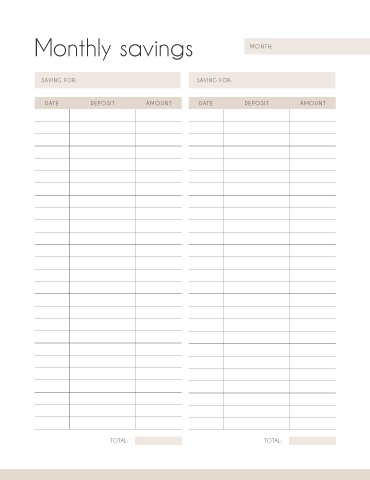 Monthly savings MONTH: SAVING FOR: SAVING FOR: DATE DEPOSIT AMOUNT DATE DEPOSIT AMOUNT TOTAL: TOTAL:
