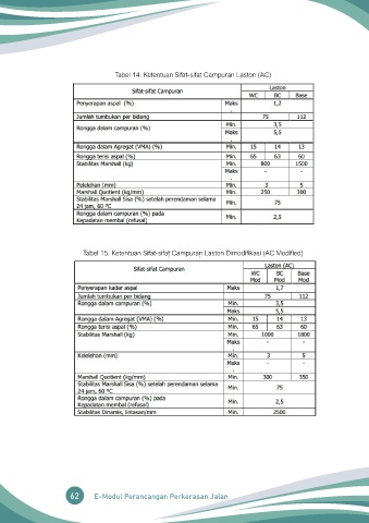 Tabel 14. Ketentuan Sifat-sifat Campuran Laston (AC) Tabel 15. Ketentuan Sifat-sifat Campuran Laston Dimodifikasi (AC Modified) 62 E-Modul Perancangan Perkerasan Jalan