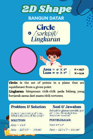 2 D S h a p e 2D Shape BANGUN DATAR π = 22/7 π = 3.14 Circle: is the set of points in a plane that are equidistant from a given point Lingkaran: himpunan titik-titik pada bidang yang berjarak sama dari suatu titik tertentu