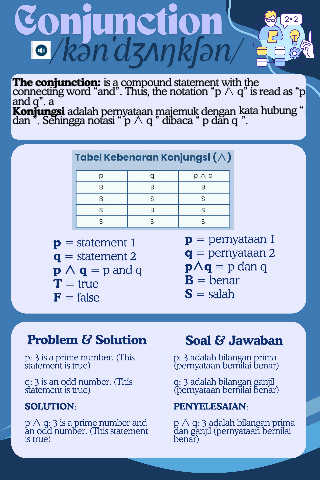 The conjunction: is a compound statement with the connecting word “and”. Thus, the notation “p ∧ q” is read as “p and q”. a Konjungsi adalah pernyataan majemuk dengan kata hubung “ dan ”. Sehingga notasi “ p ∧ q ” dibaca “ p dan q ”.