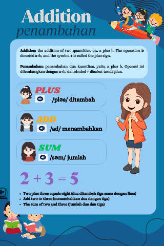 Two plus three equals eight (dua ditambah tiga sama dengan lima)