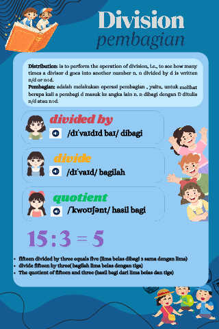 fifteen divided by three equals five (lima belas dibagi 3 sama dengan lima)